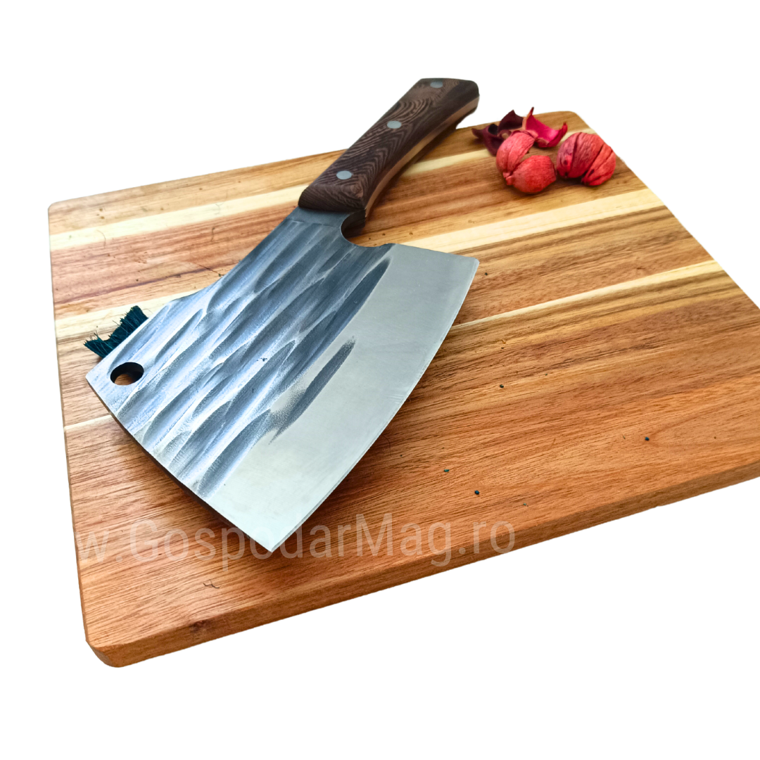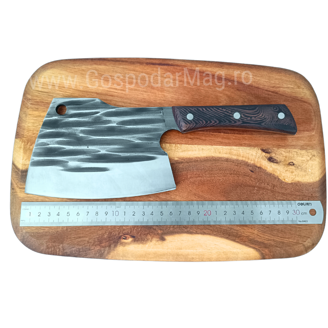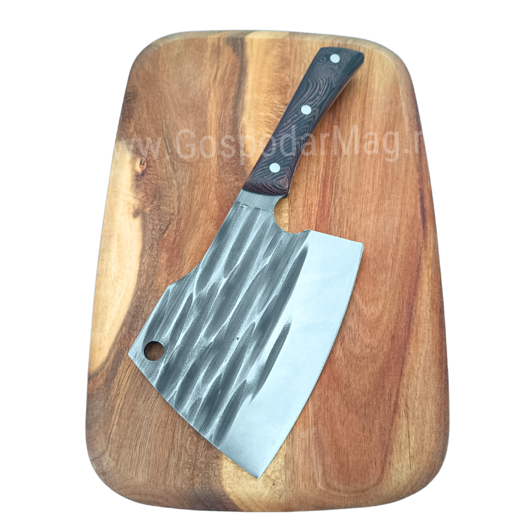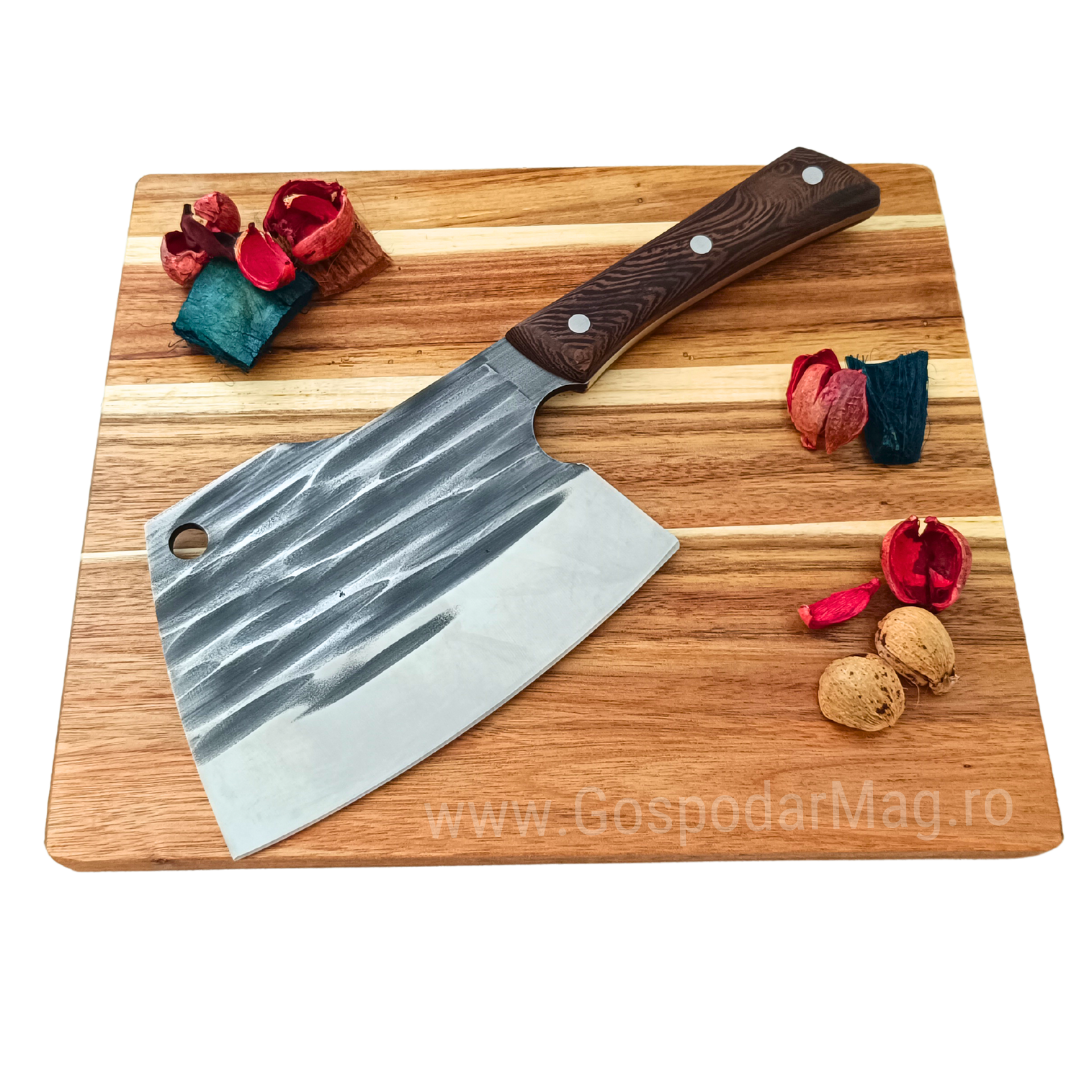 Satarul din oțel carbon este o unealtă deosebită, ideală pentru măcelari in lucrul cu oasele sau in alte activități diverse în gospodărie. Construit dintr-un oțel carbon de calitate superioară, acest satar combină durabilitatea și rezistența cu ascuțimea remarcabilă a tăișului. Designul robust al lamei și greutatea sa considerabilă il fac potrivit pentru sarcini care necesită putere și precizie, precum despicarea oaselor. Cu toate acestea, versatilitatea sa se extinde dincolo de bucătărie. Datorită greutății și construcției solide, acest satar poate fi folosit cu ușurință în gospodărie pentru activități precum tăierea lemnelor sau poate deveni un partener de încredere în excursiile de camping, unde puterea și utilitatea unei astfel de unelte devin esențiale.